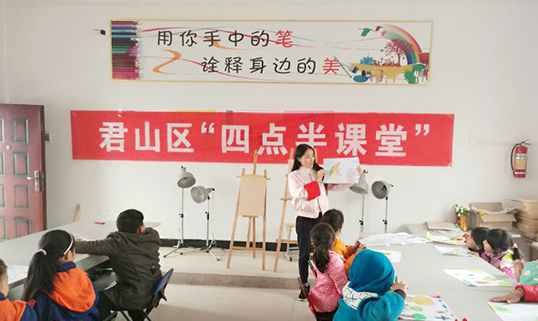 由于学生一般下午4时30分左右就放学,而家长要到下午5时30分左右才能下班,为了让少年儿童尤其是单亲家庭的孩子和留守儿童在放学后有一个有益的活动场所,快乐安全度过这近60分钟的“管理真空”,同时,也为了提升学生社会交往、自信心树立、潜能发掘等能力,君山区乡村少年宫联合区文化馆每周开展了“四点半课堂”志愿服务活动,组织素质较高的文化志愿者及少年宫的专业老师等一起辅导孩子做功课,并穿插一些音乐、美术、舞蹈、书法、心理教育知识等活动。值得一提的是,这个活动完全免费为孩子们提供艺术培训。据楼西小学少年宫的专业教师廖婕介绍,以此种方式对孩子进行辅导管理,既减轻孩子上学负担,也有利于解决家长的后顾之忧。还能让孩子们感受温馨的学习氛围,更加热爱校园学习和生活,也能营造温暖健康的成长环境,给孩子带来精神上的慰藉。