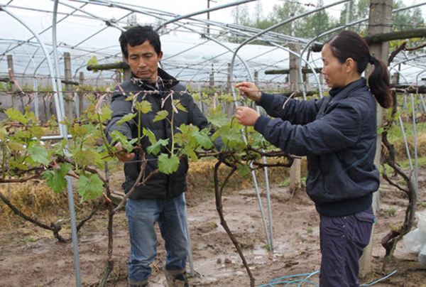 不等不靠,不埋不怨,陈子怀夫妇暴风雨一停,就立即组织人员清沟排渍,将大棚里的渍水排出去,将大棚外的水沟加深,降低地下水。同时,针对15亩通过促成栽培技术、失去了提前上市资格的葡萄,他全部舍弃,从根部进行重新裁断,促生新枝,让这些葡萄藤通过一年的培管,重新安排树冠,为明年的高产打下基础。对于另外的5亩简易大棚里的葡萄,他根据区农业局技术人员的指导,通过抹芽、定梢、引绑、疏花、疏果、套袋等程序进行维护,确保损失降到最低。
