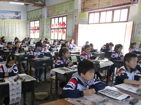 据悉,学校的课间操除了做广播体操,学生们爱跳的兔子舞,还有雷打不动的经典诵读。学校专门安排专人专讲国学课,开设了国学堂。在全校1至6年级中挑选品学兼优的学生成为国学弟子,学习书法、诗词、楹联等,让孩子们体验联墨文化,感受艺术魅力与先贤的睿智,传承中华精髓。在学校石林碑里,大部分都是国学班学生的作品,或行书、或楷书、或草书。年初,岳阳市书协副主席高树槐率砚田书法俱乐部成员一行来黄金小学参观交流,对该校作为一个乡村小学崇尚国学教育深受感动,当场做出了“胸中丘壑看吾辈,笔底云霞羡少年”的对联,并对只有7岁小女孩易恋的书法赞许有加,表示会收她作为自己的关门弟子。