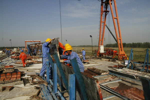 君山区现有杭瑞高速公路,蒙华铁路2条交通大动脉正在紧张施工,具体分为临岳高速、荆岳铁路、公路大桥与铁路大桥四大工程。两路两桥的建设是推动君山经济社会加快发展的新机遇,是打造君山生态明珠、造福君山人民的重要推动力量。国庆期间天气晴好,是洞庭湖(铁路、公路)大桥施工的最佳时期,为抢抓时间和进度,该区在建的国家重点工程项目两路两桥的施工人员全部坚守在施工一线,趁着国庆晴好天气抢抓进度。在负责临岳高速洞庭湖大桥建设的大岳高速14标现场,许多工人正在紧张的进行装模、搭架,做到大桥在一个又一个的桥墩中间联接延伸,晚上就抢抓晴好天气进行卸模,以备第二天又进行装模。来自四川的杨正新正在紧张有序地进行装模,他一边拧着镙丝一边介绍:“公司对我们非常重视,国庆期间不但有加班工资,还每天加餐,并安装了多部电话让我们在空闲时间家里联系沟通,人性化的服务,让我们深受感动。”