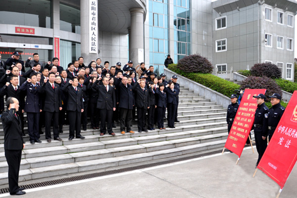 “我宣誓:忠于中华人民共和国宪法,维护宪法权威,履行法定职责,忠于祖国,忠于人民,恪尽职守、廉洁奉公,接受人民监督,为建设富强、民主、文明、和谐的社会主义国家努力奋斗!”今年12月4日,是第二个国家宪法日。上午8时,君山法院在升国旗仪式和对宪法宣誓活动中开始了一天的工作。