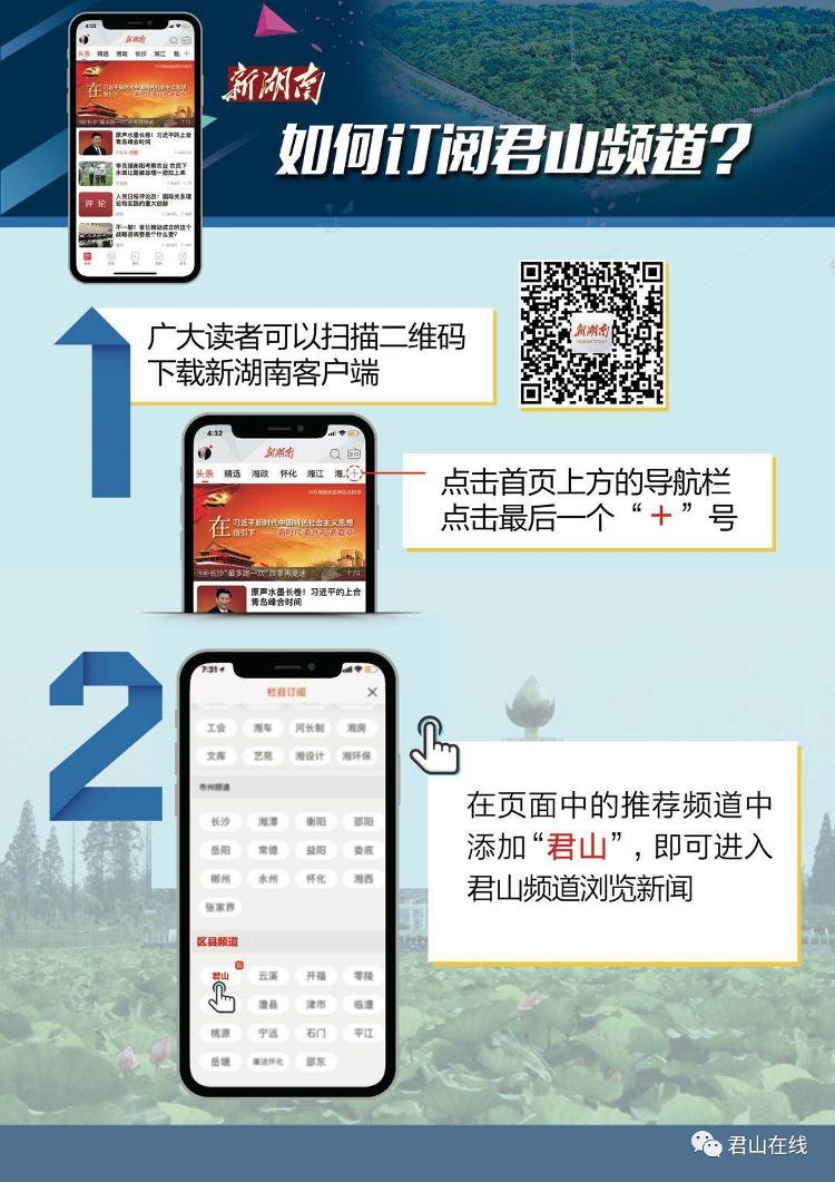 读者可以下载新湖南客户端,点击首页上方的导航栏,点击最后一个“+”号,在页面底端的机构频道点击“区县”,添加“君山”,即可进入君山频道浏览。进入君山频道后,整个界面编排多样、图文并茂,各新闻按照上传时间先后顺序纵向排列,每条新闻标题下端可以显示所属栏目和点击量。