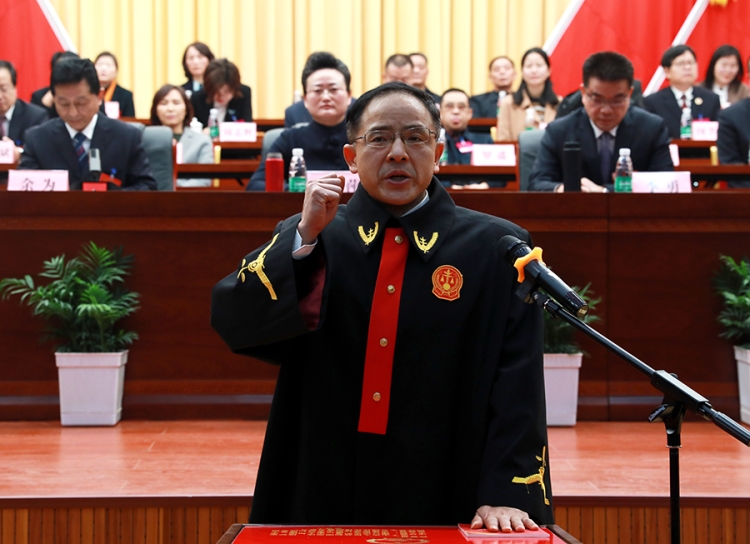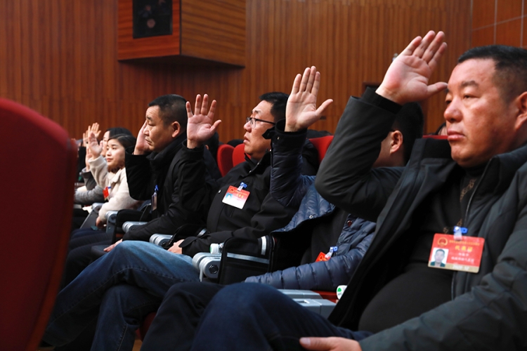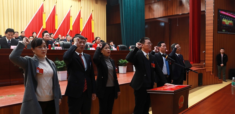 大会进行了新当选人员向宪法宣誓仪式。新当选人员面向庄严的国旗,左手抚按《中华人民共和国宪法》,右手举拳进行宣誓。