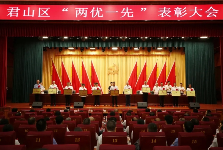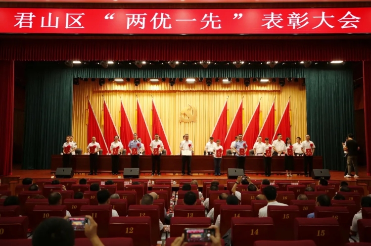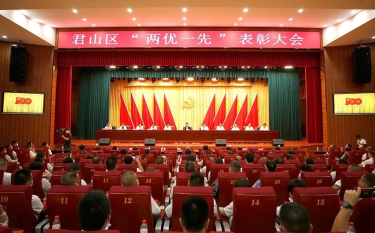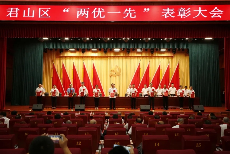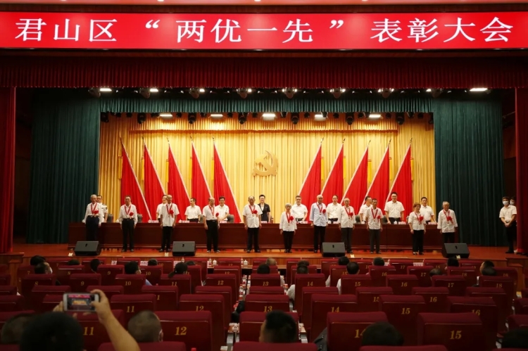 在党的百年华诞即将到来之际,6月28日,君山区召开全区“两优一先”表彰大会,会议组织收看了百年党史润君山专题片,回顾党的光辉历程,讴歌党的丰功伟绩,为党龄50年以上的老党员代表颁发“光荣在党50年”纪念章,表彰全区优秀共产党员、优秀党务工作者和先进基层党组织,进一步动员和激发全区各级党组织和广大党员,不忘初心、牢记使命,振奋精神、强化担当,书写“守护好一江碧水、建设好精致君山”的崭新篇章,以最坚定、最自觉的行动向党的生日献礼。