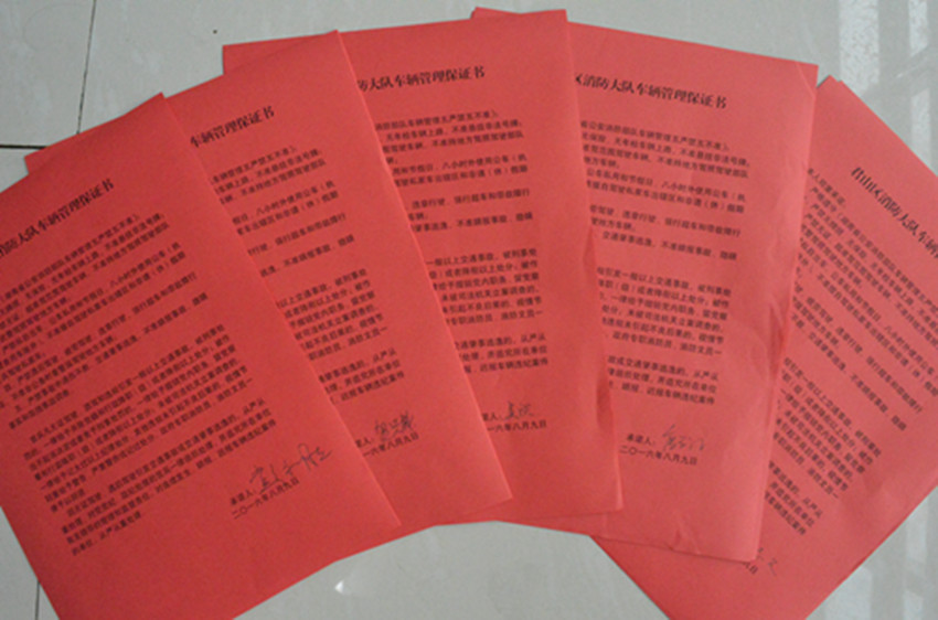 二是检查官兵有无违反车辆管理“五严禁五不准”情况,摸底了大队全体官兵驾驶证情况,并与全体官兵签订了《君山区消防大队车辆管理保证书》。