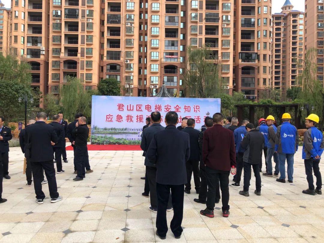 10月19日,君山区开展电梯安全知识应急救援演练进社区活动,活动现场通过摆放展板、发放宣传资料等多种形式向群众宣传电梯安全知识。在君山一号3栋,工作人员模拟演练电梯发生困人事故,被困人员紧急按响报警装置,值班人员在确认发生事故后,立即向电梯救援单位要求派人实施紧急救援,短短几分钟就安全解救被困人员,及时排除电梯故障,使电梯恢复正常运行。