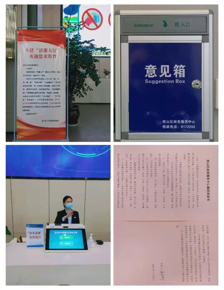 出台《君山区政务服务中心窗口及窗口工作人员考核办法》,每月发布月考核通报,对窗口及窗口工作人员进行考核评分,将考核情况在大厅进行公示。年终依据考核情况,评选出“优秀窗口”和“优秀窗口工作人员”。同时,结合“好差评”和行政效能“红黄牌”应用,转变工作作风,规范权力运行,推动构筑清廉堡垒,营造清廉环境,不断增强企业、群众获得感、幸福感、安全感。