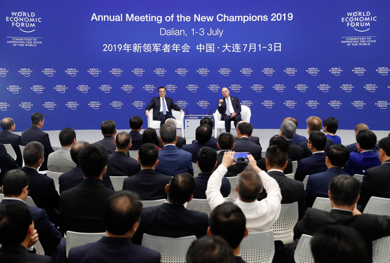 国务院总理李克强7月2日下午在大连同出席2019年夏季达沃斯论坛的国际工商、金融、智库、媒体界代表举行对话会。
