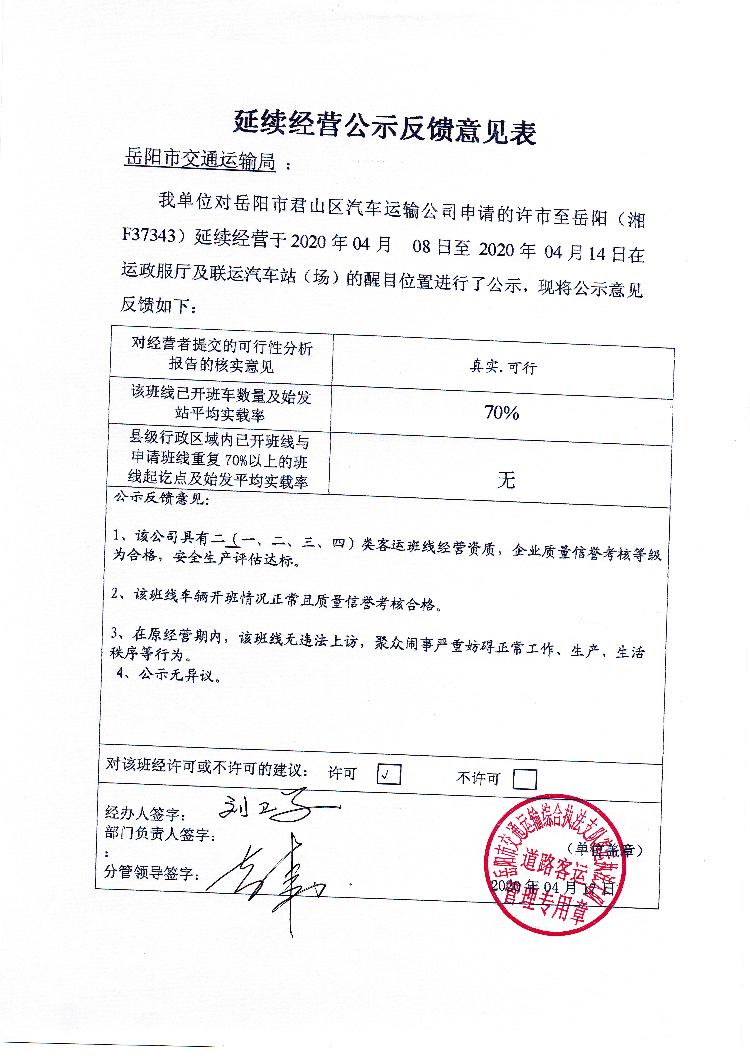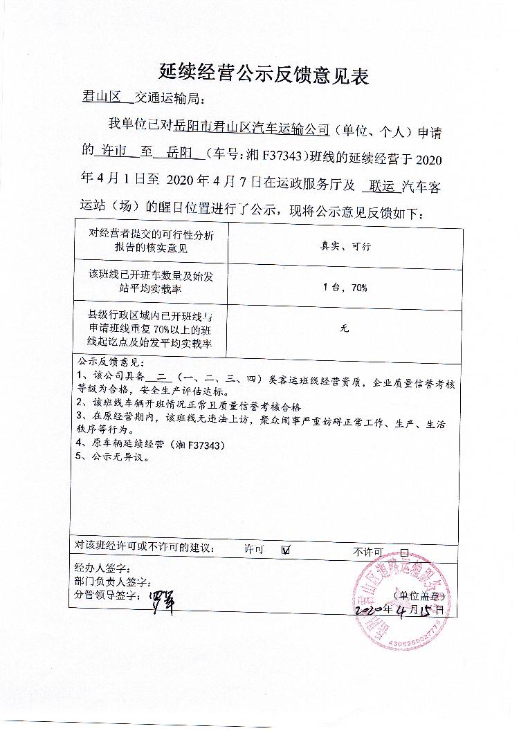 关于君山汽运公司县际班线湘F37343延续经营的公示