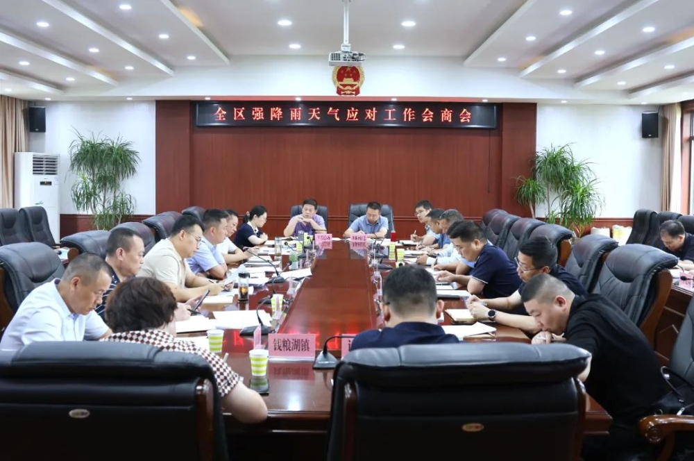 6月20日,区委副书记、区长陈淼主持召开全区强降雨天气应对工作会商会,分析研判当前防汛形势,对防范新一轮强降雨进行再动员、再部署。副区长杨曙东、赵超,区政府办主任许四海及相关单位主要负责人参加。