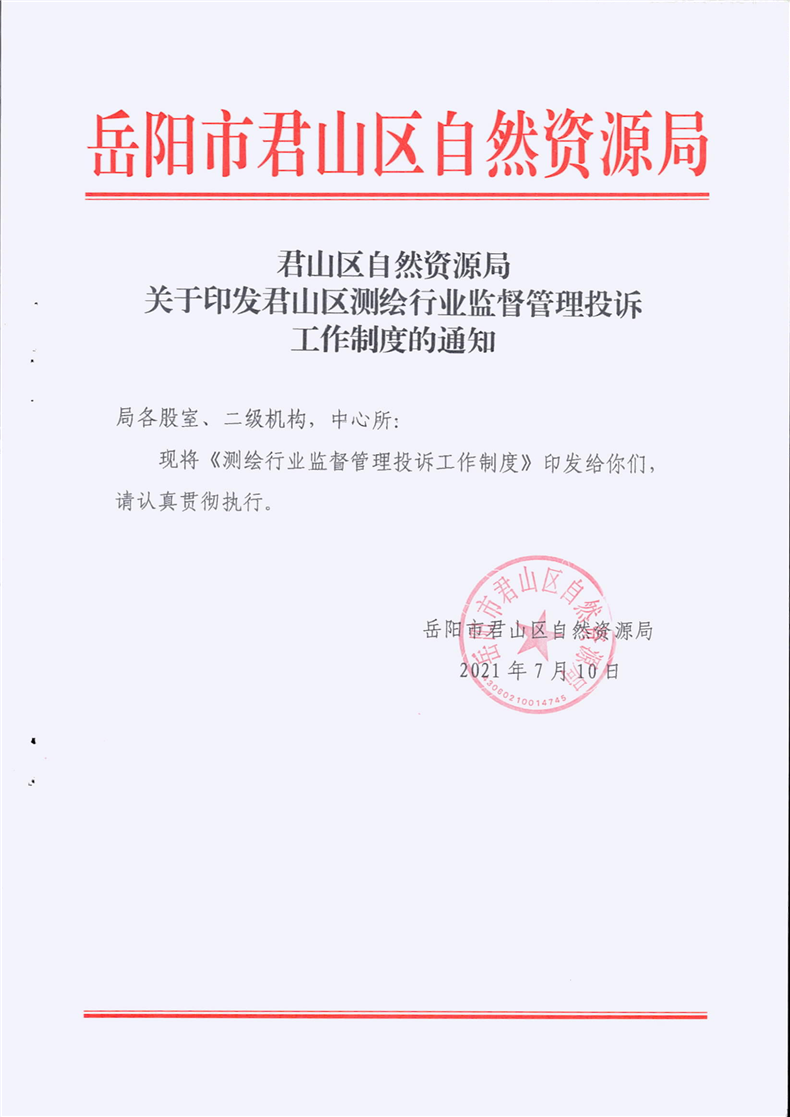 关于印发君山区测绘行业监督管理投诉工作制度的通知