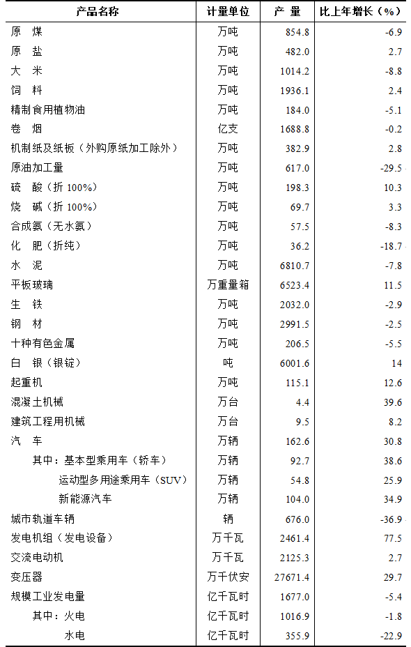 全年规模以上工业统计的主要产品产量中,大米1014.2万吨,比上年下降8.8%;饲料1936.1万吨,增长2.4%;原油加工量617.0万吨,下降29.5%;水泥6810.7万吨,下降7.8%;钢材2991.5万吨,下降2.5%;十种有色金属206.5万吨,下降5.5%;混凝土机械4.4万台,增长39.6%;汽车162.6万辆,增长30.8%;规模工业发电量1677.0亿千瓦时,下降5.4%。