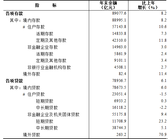 年末金融机构本外币各项存款余额89077.6亿元,比上年末增长8.2%。其中,住户存款余额57143.8亿元,增长10.6%;非金融企业存款余额14963.0亿元,增长3.0%。本外币各项贷款余额78936.7亿元,增长6.1%。其中,住户贷款余额23051.4亿元,下降1.5%;非金融企业及机关团体贷款余额55175.8亿元,增长9.4%。
