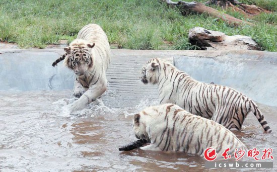 老虎兄弟在水池中泡澡嬉戏。长沙晚报全媒体记者 周柏平 通讯员 刘姝伶 摄影报道