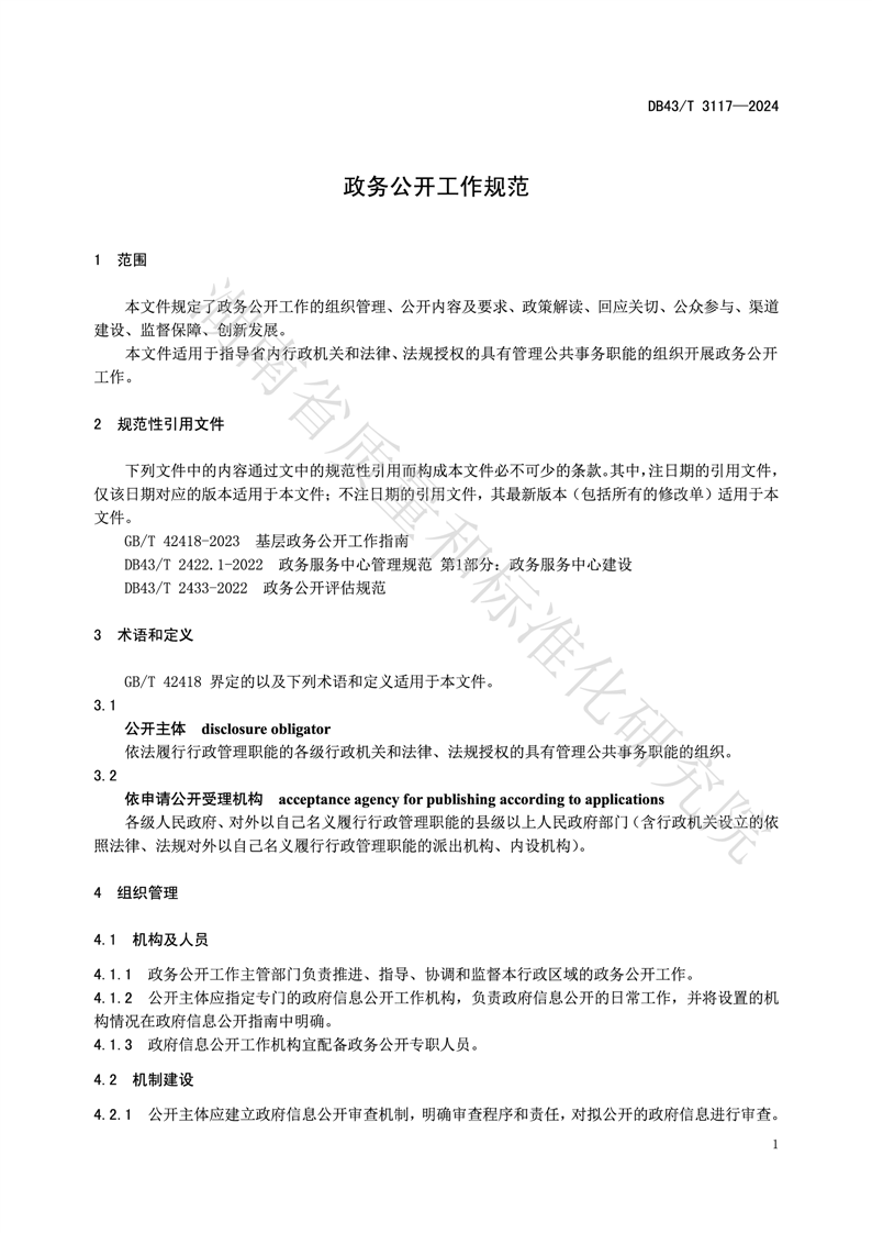 湖南省地方标准《政务公开工作规范》(DB43_T 3117-2024)