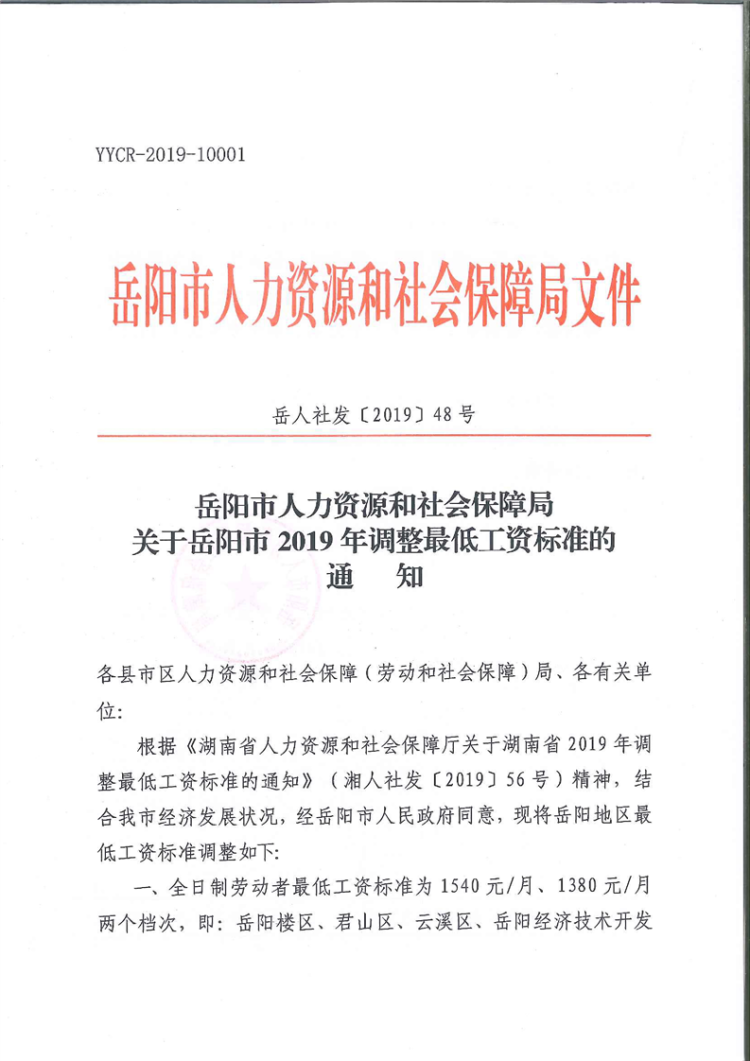 岳阳市人力资源和社会保障局关于岳阳市2019年调整最低工资标准的通知