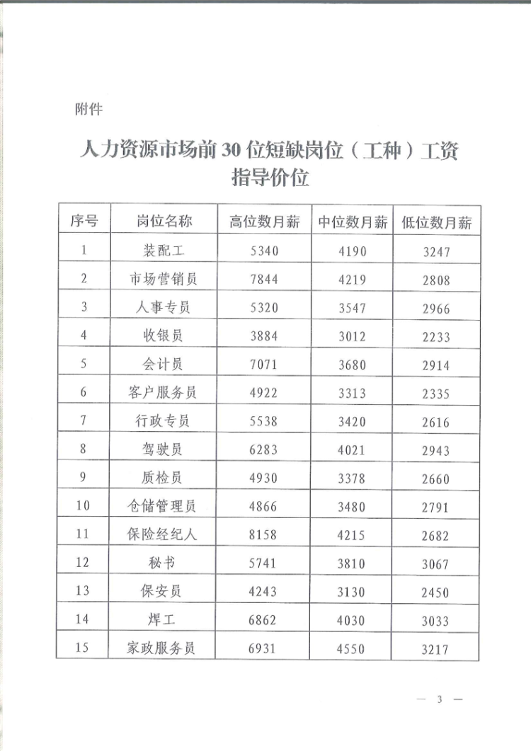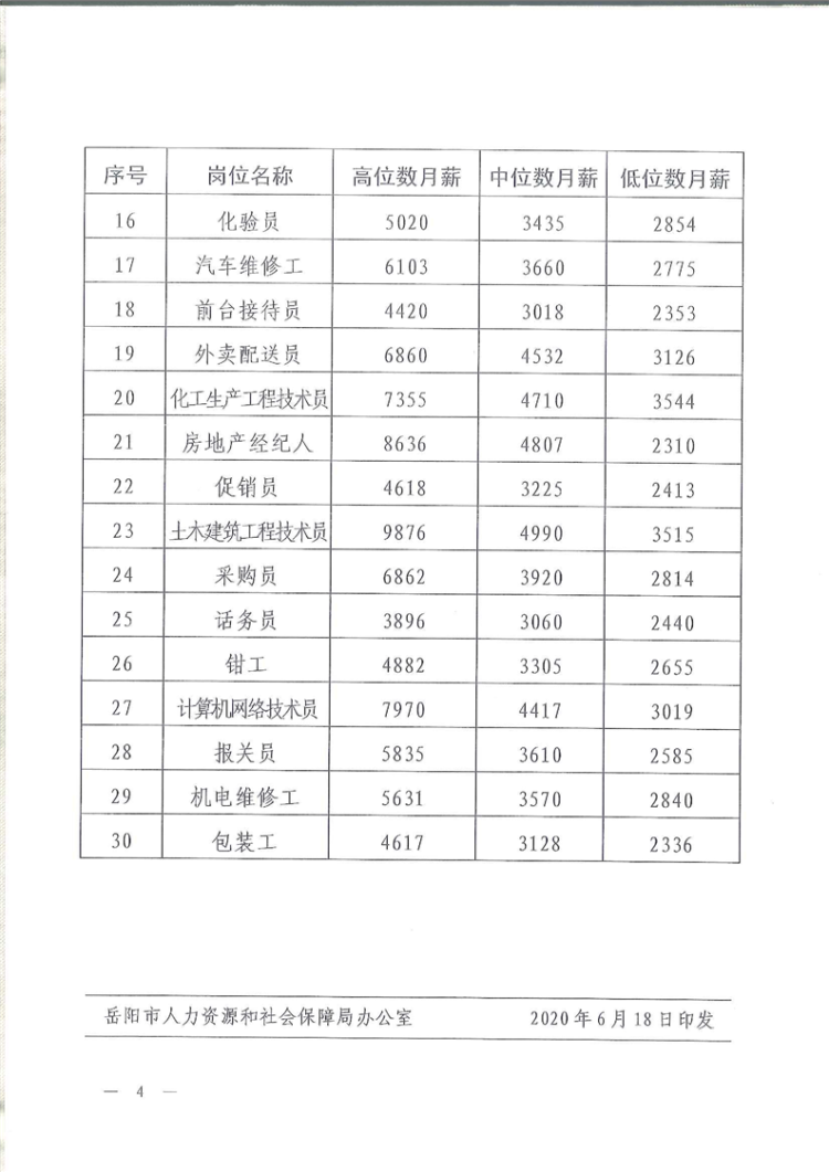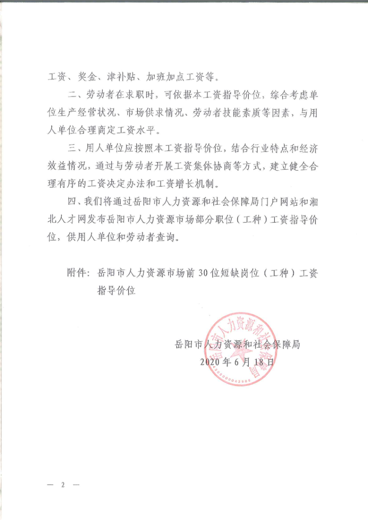 岳阳市人力资源和社会保障局关于发布我市人力资源市场前30位短缺岗位(工种)工资指导价位的通知