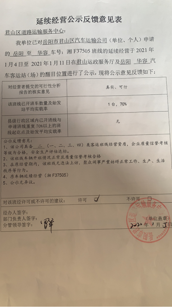 现将我局受理的道路旅客运输相关事项进行公示,如有意见或建议的,请于公示之日起5个工作日内书面向我局行政审批股反映,并在反映材料上署名,所反映的内容必须真实。