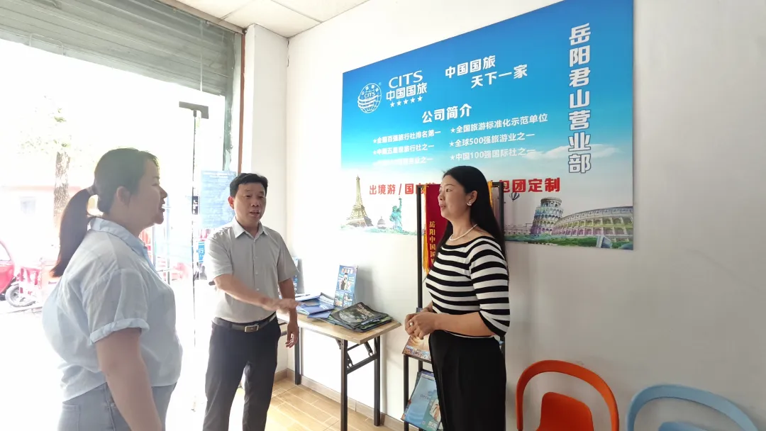 5月28日,君山区文旅广体局负责人带队深入国旅营业网点、康辉营业点、麋鹿苑景区、江豚湾景区以及栖夕田园民宿等文旅经营单位,实地检查旅行社、导游是否有无证经营、强迫购物、不规范签订合同、虚假宣传等情况,检查旅游景区安全生产、客流摄像机在线状态等。