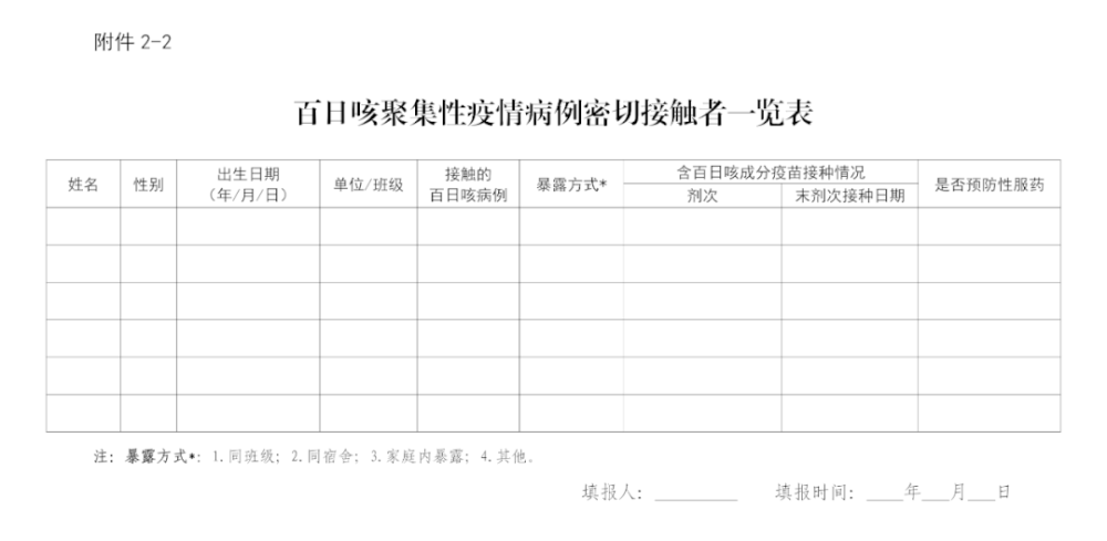 2.密切接触者判定。根据流行病学调查及聚集性疫情的暴露风险评估结果,县级疾控机构负责及时对密切接触者进行判定,并填写《百日咳聚集性疫情病例密切接触者一览表》(附件2—2)。