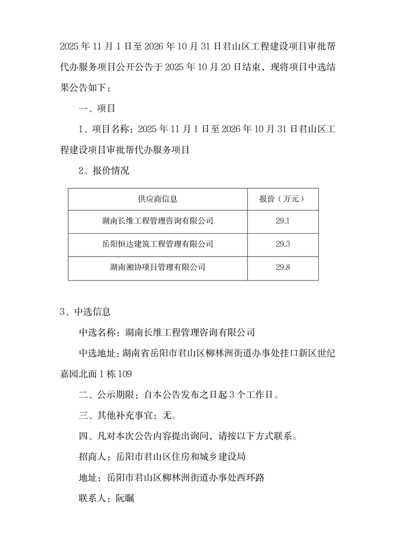 2025年11月1日至2026年10月31日君山区工程建设项目审批帮代办服务项目公开招商中选公告