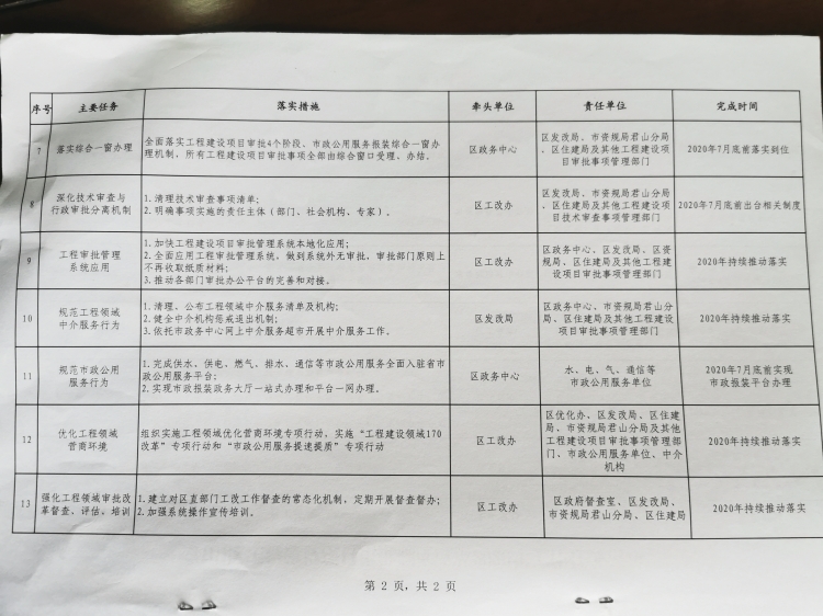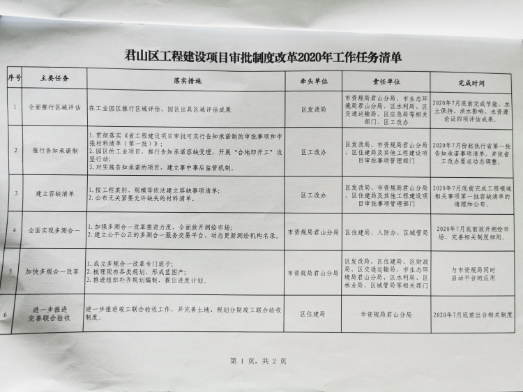 关于印发《君山区工程建设项目审批制度改革2020年工作任务清单》的通知