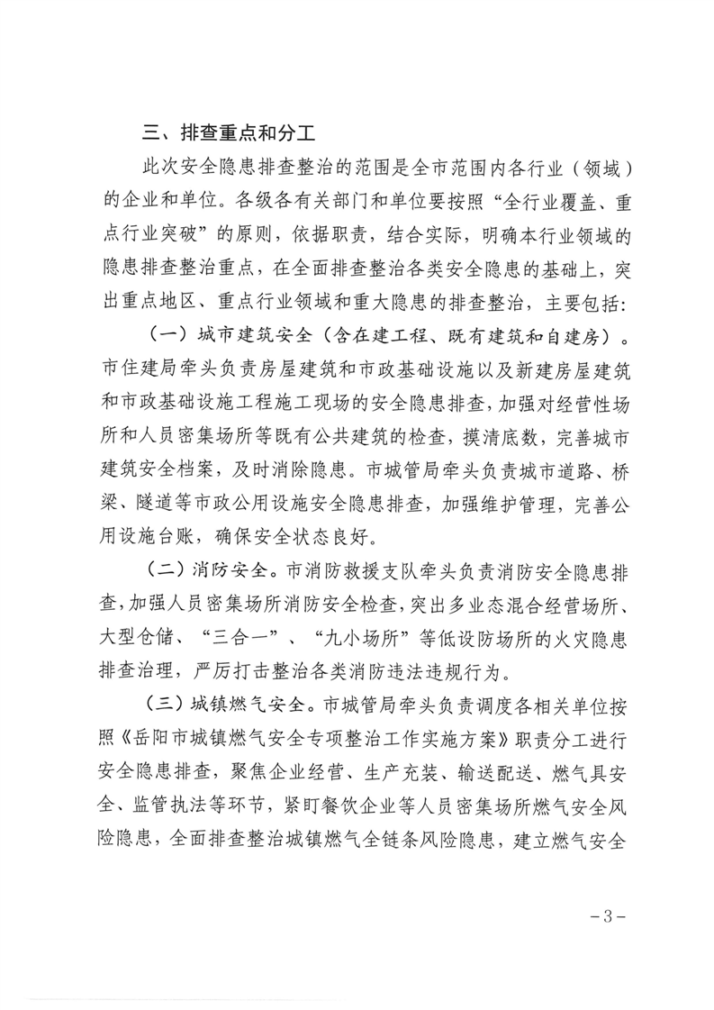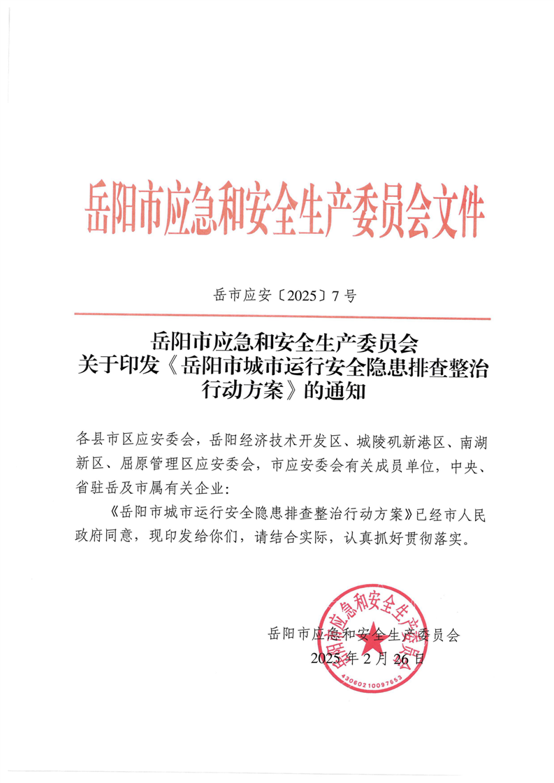 关于印发《岳阳市城市运行安全隐患排查整治行动方案》的通知