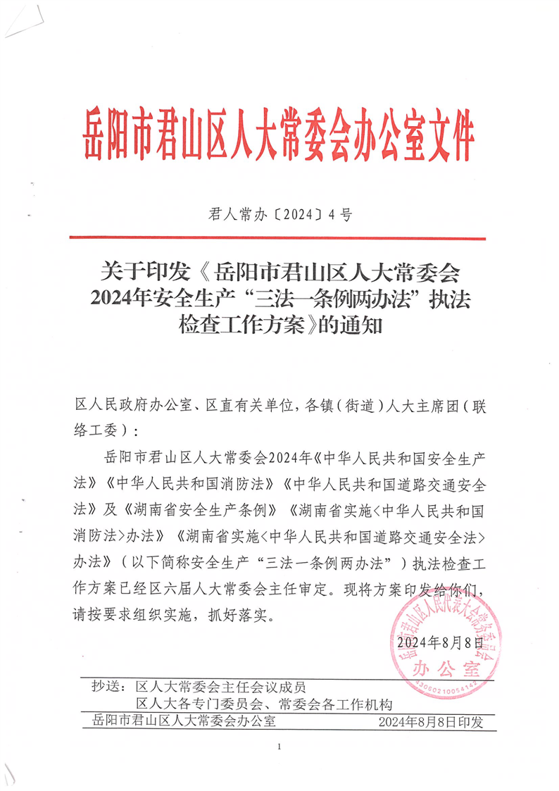 关于印发《岳阳市君山区人大常委会 2024年安全生产“三法 条例两办法”执法检查工作方案》的通知