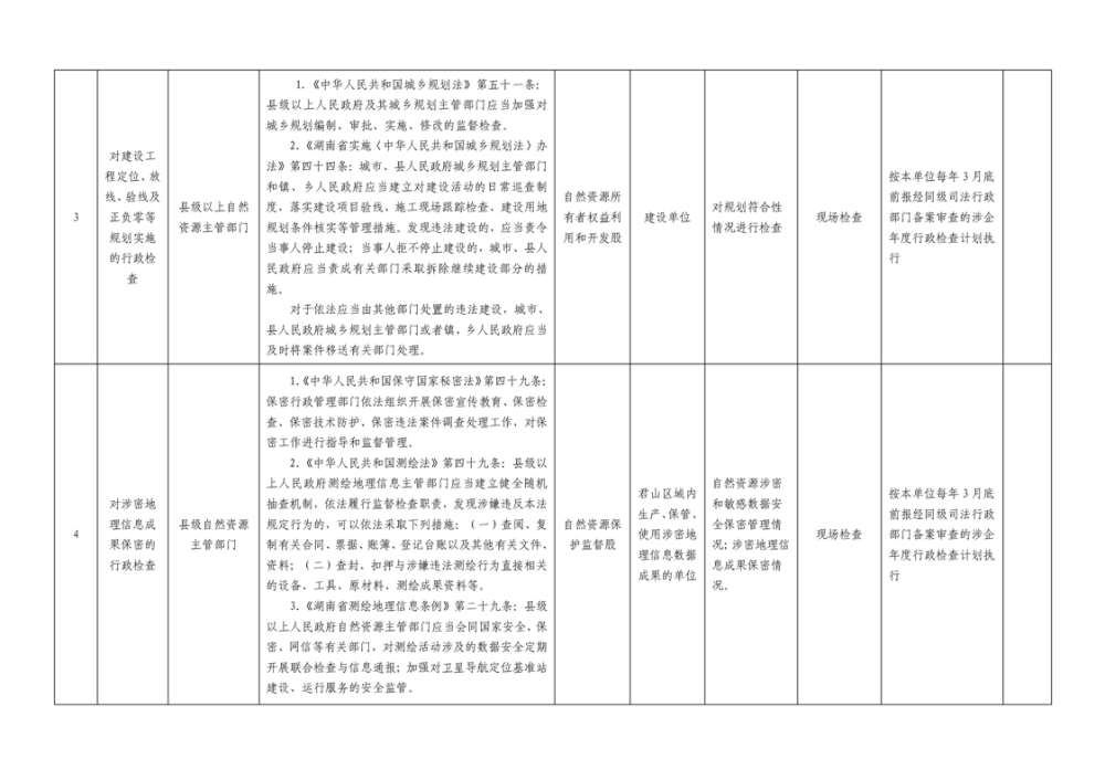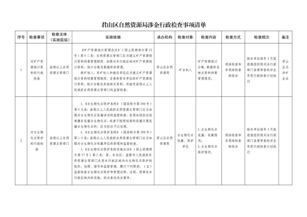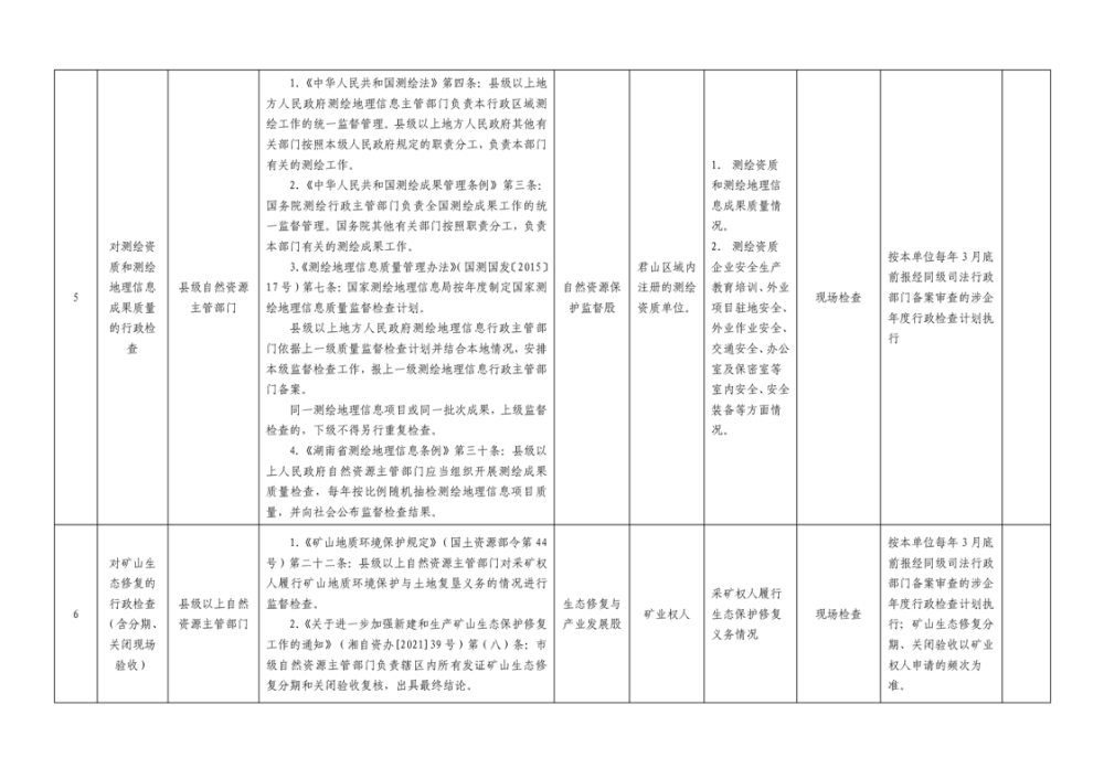 君山区自然资源局涉企行政检查事项清单