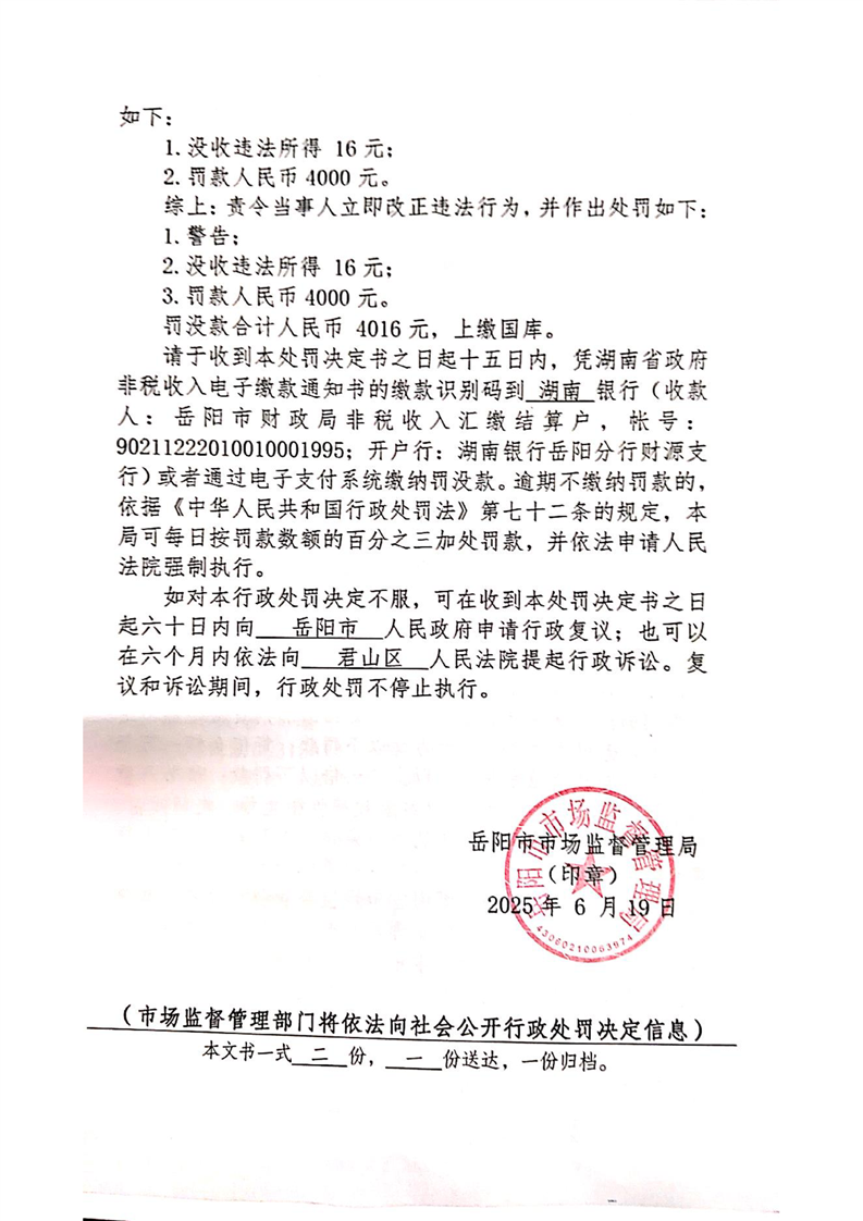 岳阳市市场监督管理局行政处罚决定书 岳市监处罚〔2025〕3-11号