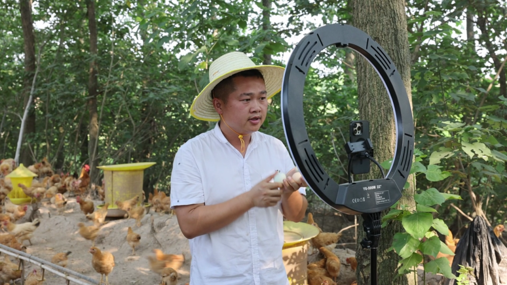 2022年担任村党总支书记后,尹健推出“一斤换一只”助农模式,有效降低农户养殖风险。他还借助抖音直播带货,不仅销售土鸡、鸡蛋,还帮助村民消化滞销农产品。如今,他的合作社年出栏土鸡超过2.2万只,年收入突破200万元,累计带动33户农户实现稳定增收。