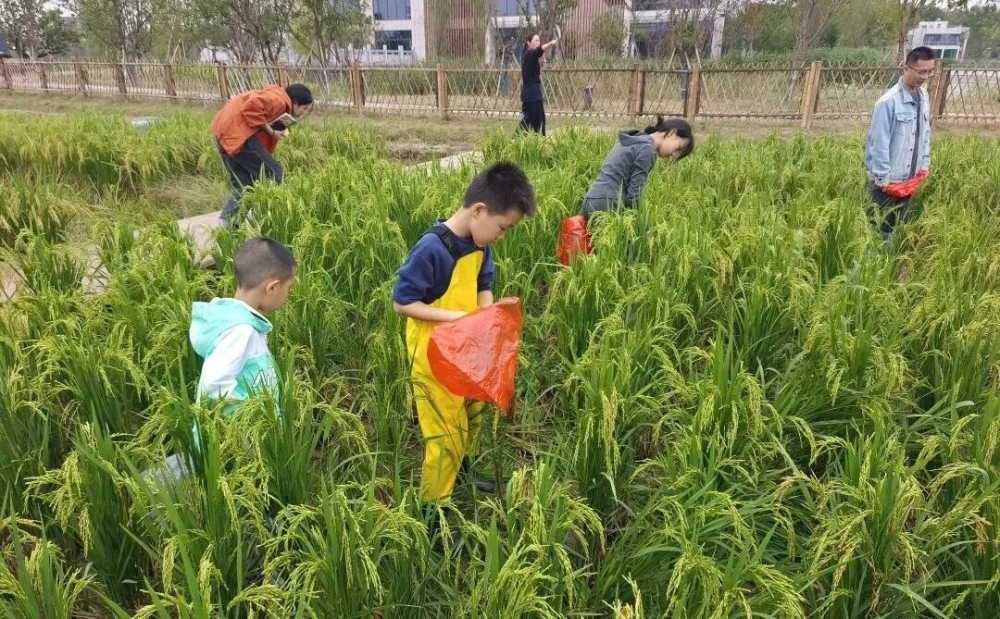 “稻田寻宝”充满探索的乐趣。稻田中被悄悄藏入各种“宝藏”——可能是小乌龟玩具,也可能是小螃蟹、小海星玩具。孩子们弯腰俯身,仔细翻找,每发现一样,就兴奋地高举过头,向爸爸妈妈“报喜”。
