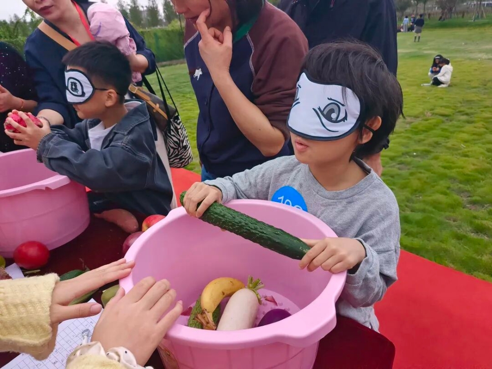 “果蔬猜猜乐”区域,孩子们通过触摸猜测箱中蔬果,调动全部感官认识自然。箱中放置了土豆、胡萝卜、黄瓜、红薯、苹果等十余种常见农产品。小朋友们小手探入,表情专注又好奇。“我摸到玉米!一粒一粒的!”“这个刺刺的肯定是黄瓜!”现场猜测声、欢笑声、鼓励声此起彼伏。