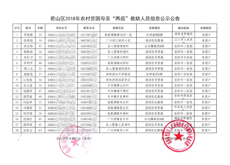 君山区2018年农村贫困母亲“两癌”救助人员信息公示