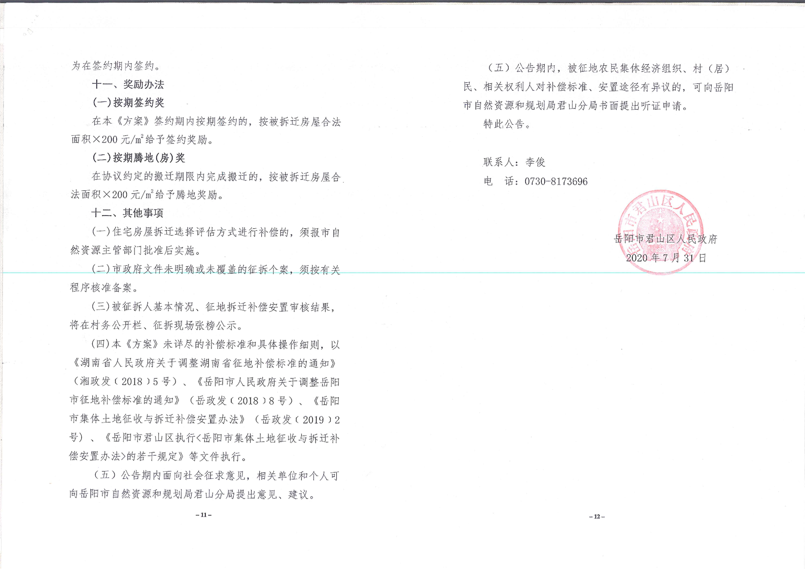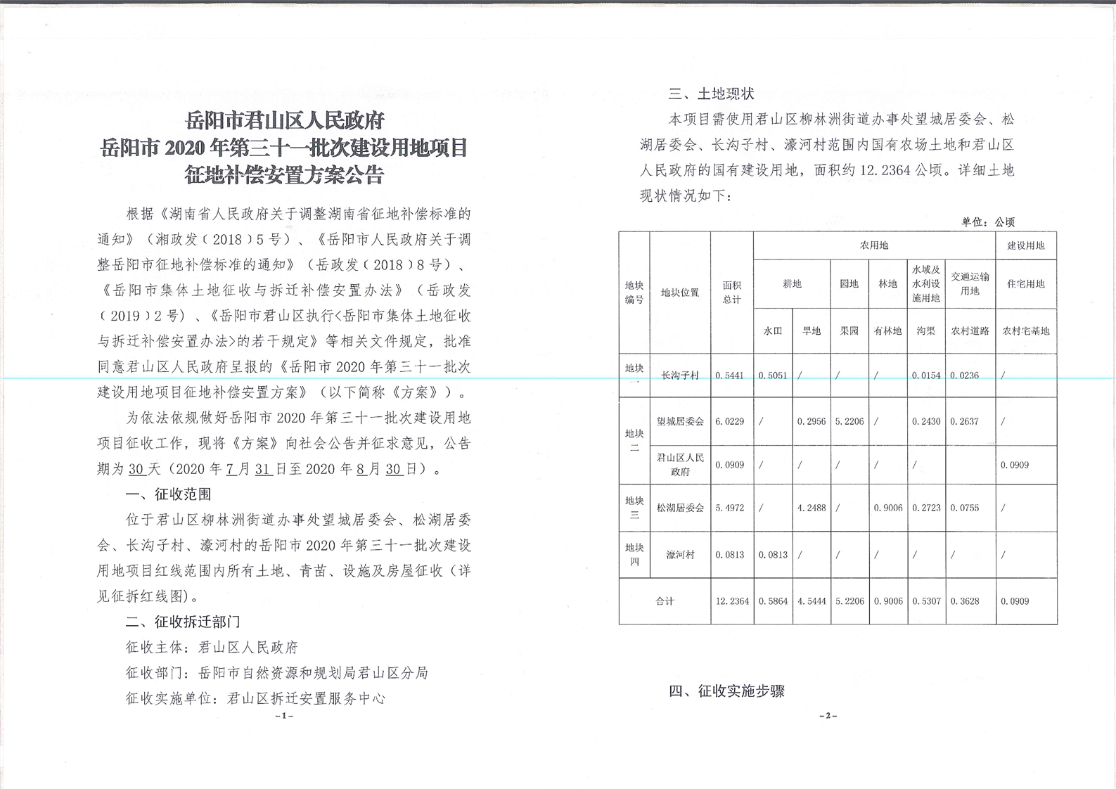 岳阳市君山区人民政府岳阳市2020年第三十一批次建设用地项目征地补偿安置方案公告