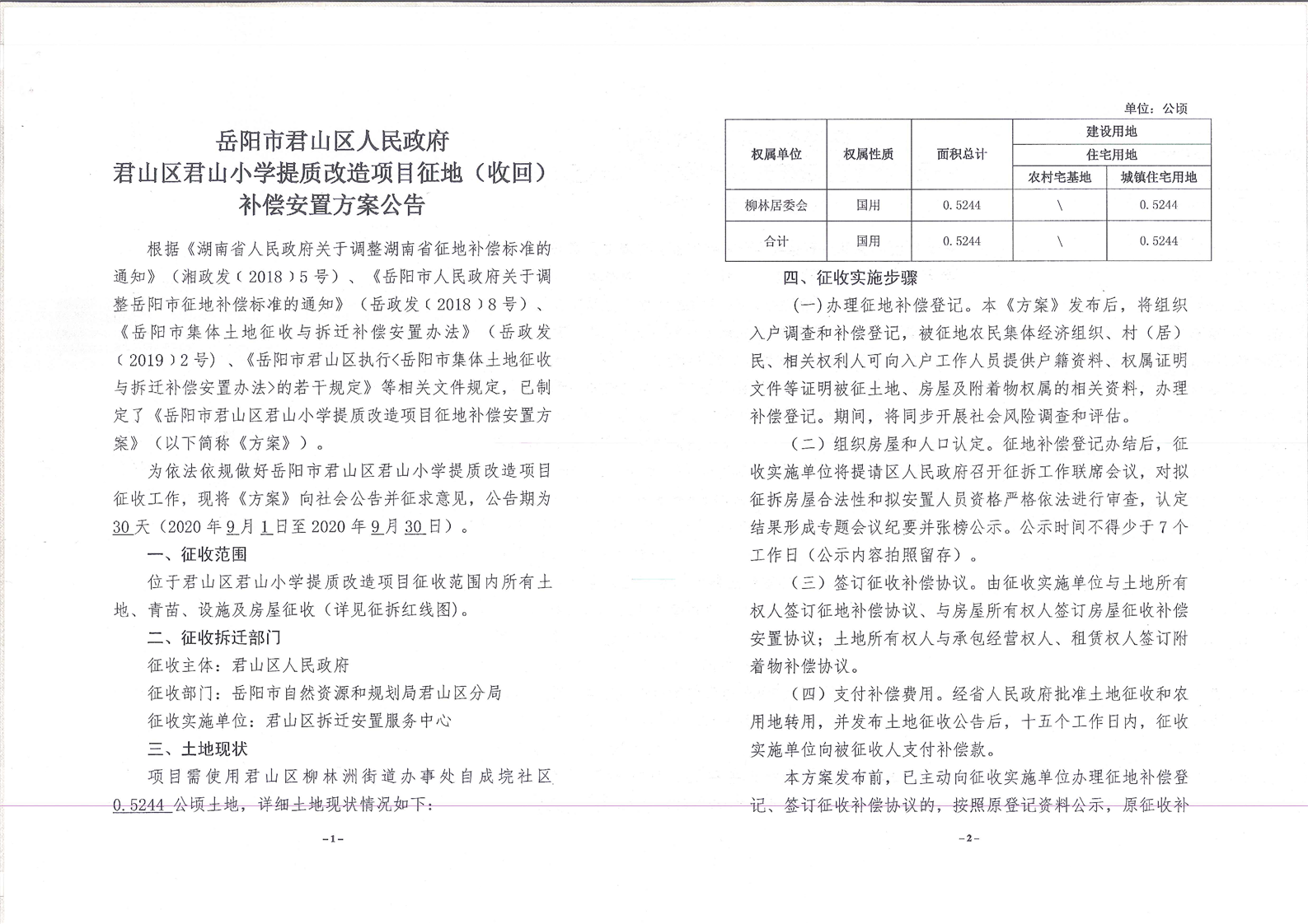 岳阳市君山区人民政府君山区君山小学提质改造项目征地(收回)补偿安置方案公告