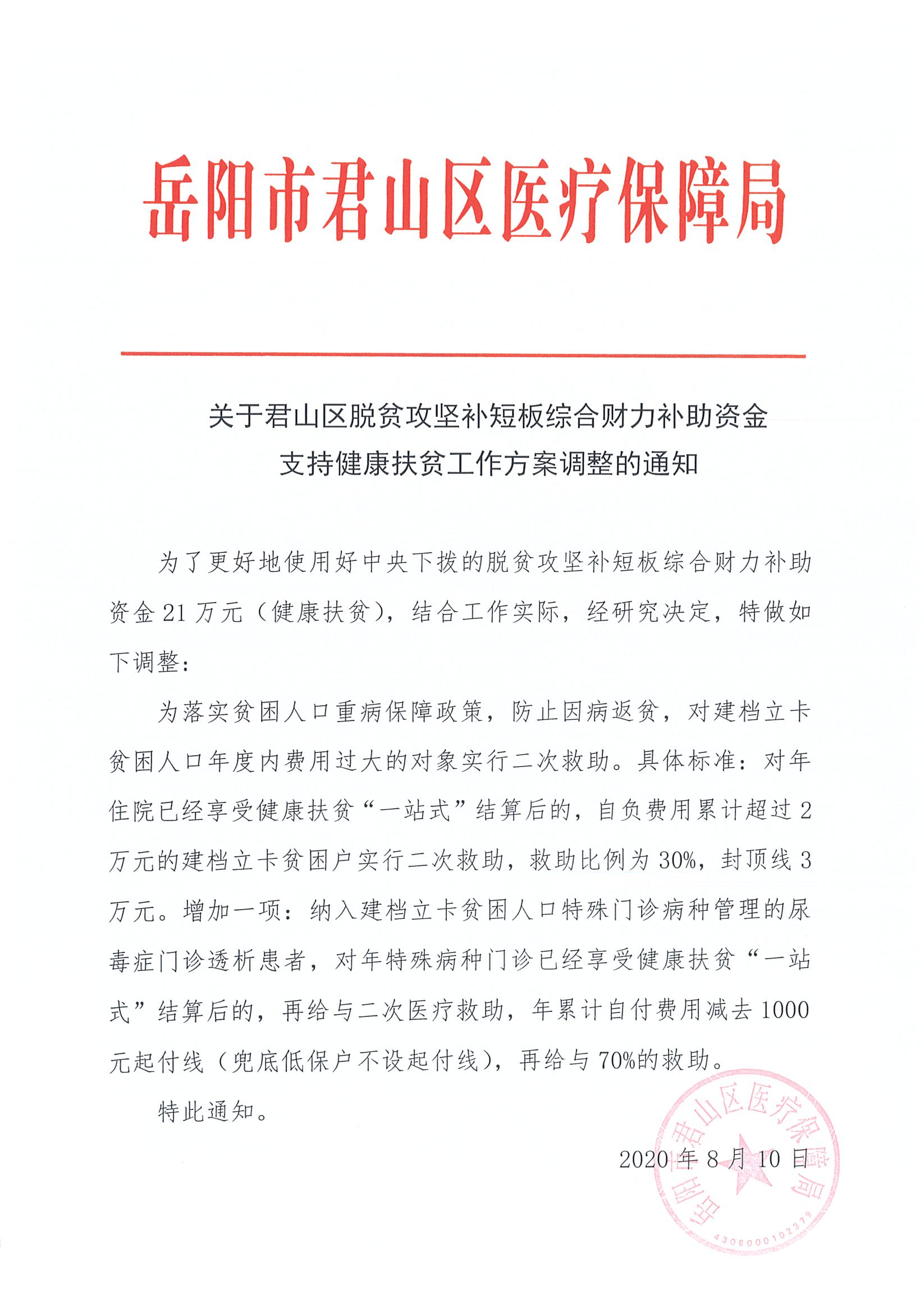 关于君山区脱贫攻坚补短板综合财力补助资金支持健康扶贫工作方案调整的通知