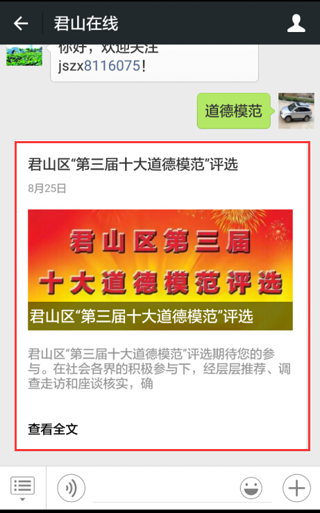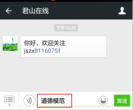 进入公众号后在对话框中发送“投票”或“道德模范”,