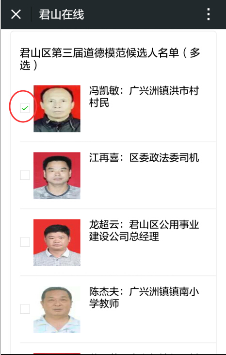 君山区“第三届十大道德模范”评选微信投票活动即日起正式启动。在社会各界的积极参与下,经层层推荐、调查走访和座谈核实,确定了20名人选,经区文明委评审会议投票确定了道德模范候选人15人。他(她)们是见义勇为道德模范候选人冯凯敏、江再喜;诚实守信道德模范候选人龙超云;孝老爱亲道德模范候选人陈杰夫、范玉花;助人为乐道德模范候选人姚志良、熊贻文、宋友才、周怡怀、沈小年;爱岗敬业道德模范候选人朱菊香、金昌华、陈新莲、黄敏香、丁丽和。(投票方式附后)