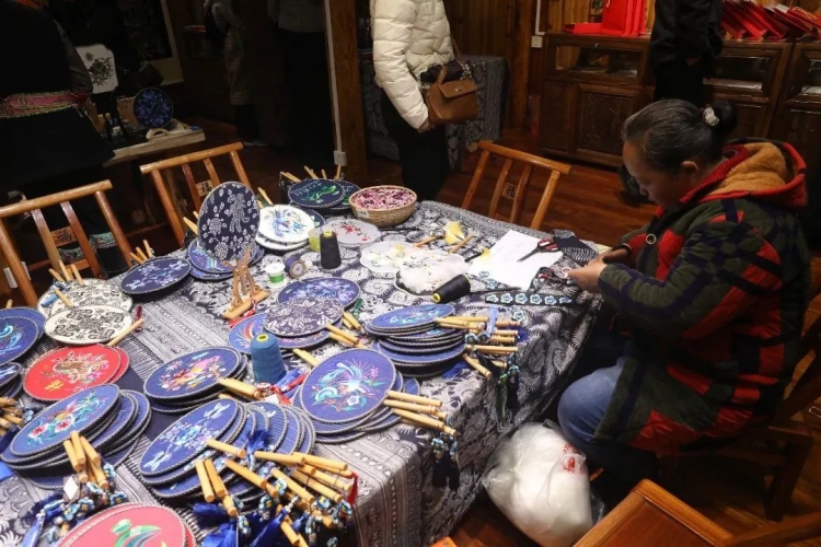 ▲梨子寨村民在特产店内展示“苗绣”技艺