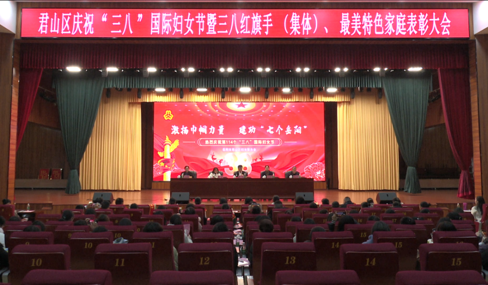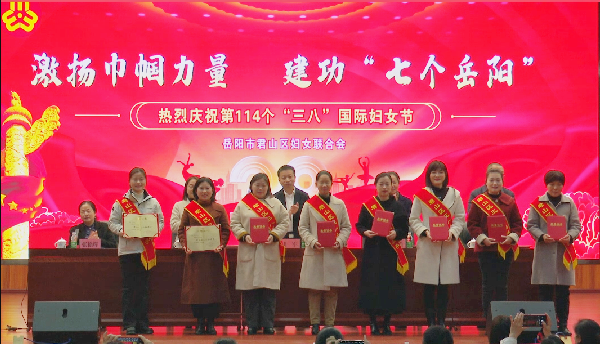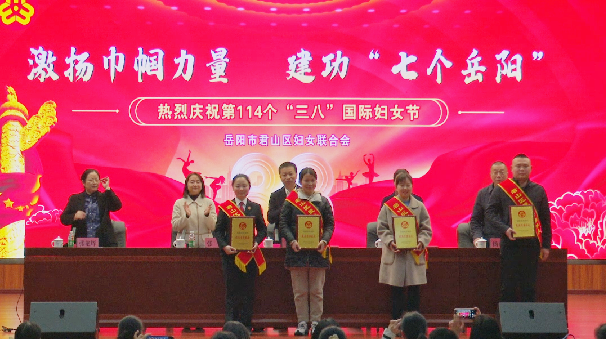 张洁宣读了《关于表彰君山区三八红旗手(集体)的决定》和《关于表彰君山区最美家庭的决定》,并为获得表彰的区三八红旗手(集体)、区最美特色家庭颁发奖牌或荣誉证书。