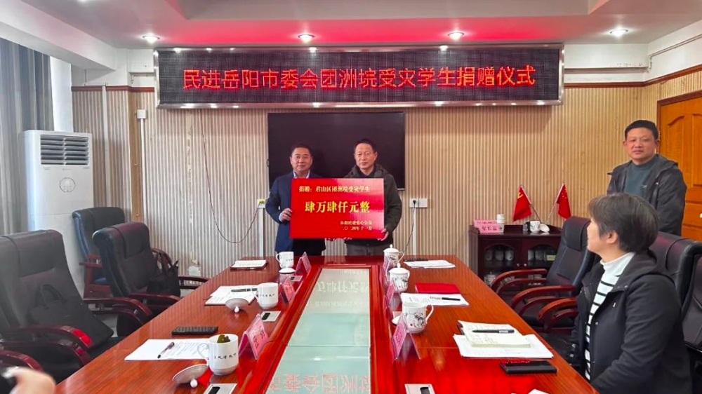 11月28日,民进岳阳市委会在君山区开展捐助活动,向团洲垸受灾学生捐赠现金44000元。民进岳阳市委会专职副主委汪扬,区政协副主席胡思及相关单位、受捐学校负责人参加。