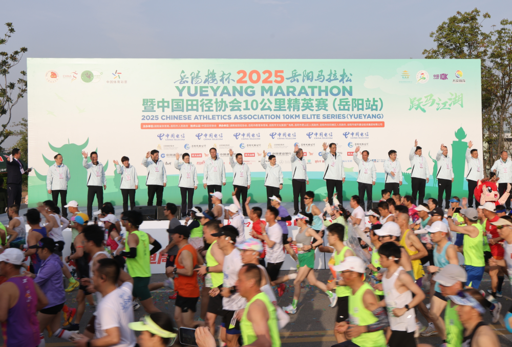 4月6日上午7:30,岳阳楼杯2025岳阳马拉松暨中国田径协会10公里精英赛(岳阳站)在岳阳市君山区“守护好一江碧水”展陈馆鸣枪开赛。
