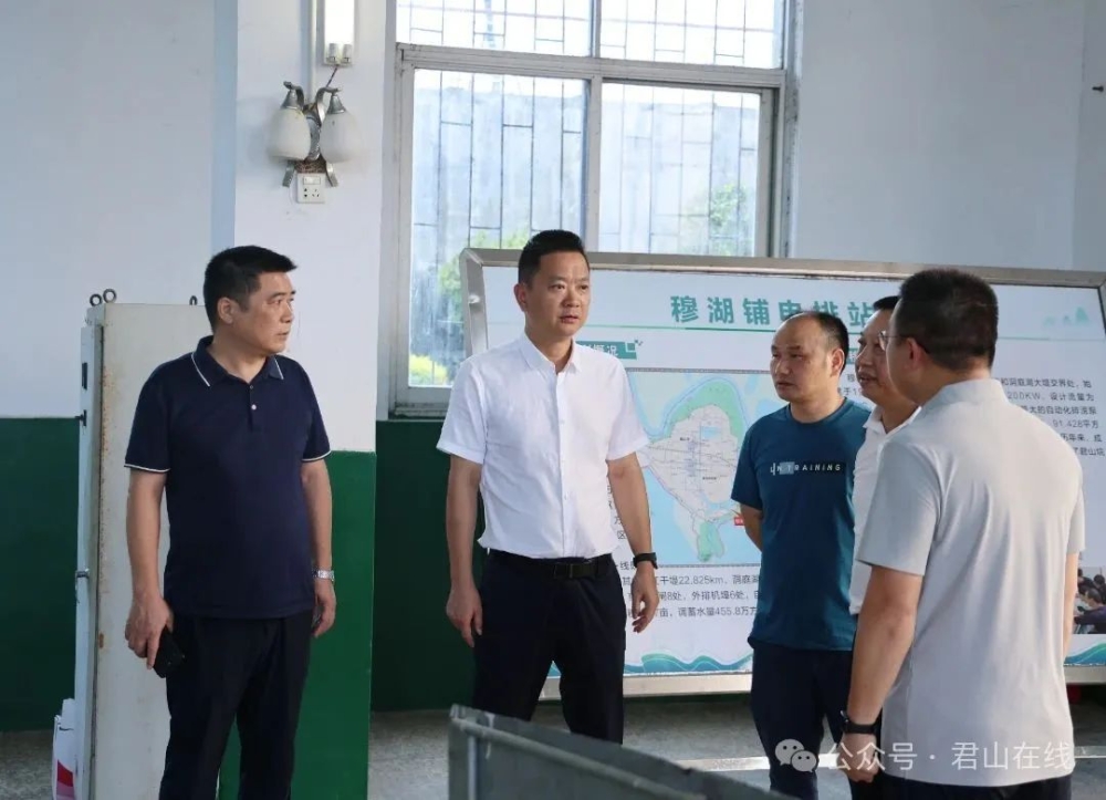 在君山垸穆湖铺电排站,陈淼仔细查看电排机组运行状态,详细了解设备排水能力及调度机制。他强调,电排设施是防汛的关键环节,必须加强日常检修和维护,确保机组高效运行,有效应对内涝风险。