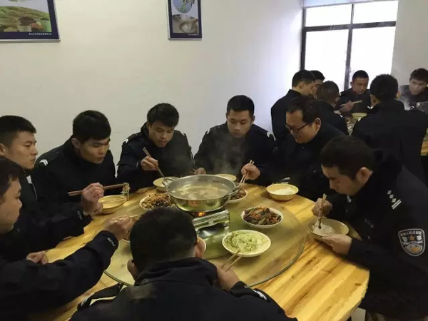 中午12:00,忙碌辛苦了一天的巡逻队员们,才开始到吃午饭和休息。在巡特警支队,不论职务大小都是围坐一桌,10个人6菜一汤的配备。练了一上午的队员,显然胃口极佳,大家不多话,很快便将饭菜一扫而光,并自觉地把碗筷洗刷干净。