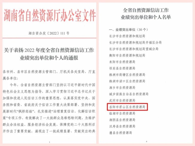 12月27日,湖南省自然资源厅通报表彰了2022年度全省自然资源信访工作先进单位,君山区自然资源局获评“湖南省自然资源信访工作业绩突出单位”。