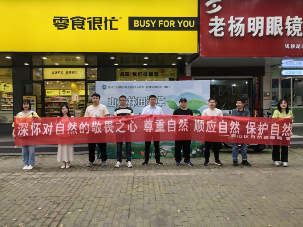 4月22日是第55个“世界地球日”,今年也是习近平总书记视察岳阳君山并提出“守护好一江碧水”殷殷嘱托六周年,为深入践行习近平生态文明思想,进一步引导全社会树立“尊重自然、顺应自然、保护自然”的生态文明理念,4月22日-25日,君山区自然资源局开展了以“珍爱地球 人与自然和谐共生”为主题的系列宣传活动。