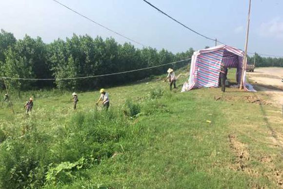 群众在大堤进行清基扫障