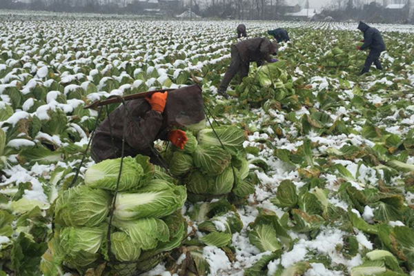 “从前天出现冰冻天气以来,我们每天组织300多个劳工,收发300多吨左右的蔬菜,销往福建、厦门、广州、山东等省。”1月22日,在广兴洲大白菜生产基地,厚厚的雪花覆盖着满地的大白菜,雇请的劳动力戴着帽子手套在冰天雪地里砍菜,挑出菜地,再运到停靠在路边的货车上进行装车。据建新蔬菜合作社负责人周先军介绍,他们合作社提前制定了详细的防灾抗寒方案和供销方案,全力运转,应对低温雨雪冰冻极端天气,并在确保蔬菜安全品质的前提下,保证市场的正常供应。