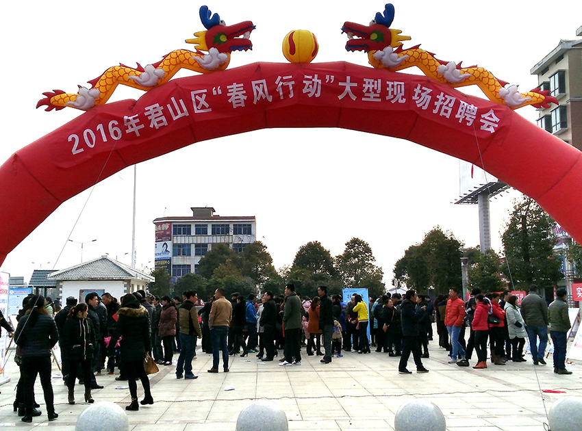 2016年2月16日上午九时(农历正月初九),区人力资源和社会保障局在君山挂口荷杏广场举办“搭建供需平台,促进转移就业”为主题的“春风行动”用工招聘会,国泰、大地印务等区内外12家企业现场招聘,提供 5000个岗位,现场4000多人参加了招聘会,1100多人达成就业意向。